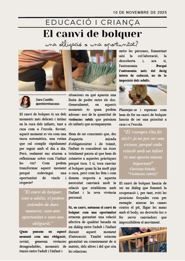“En la quotidianitat d’un canvi de bolquer hi habita la qualitat del vincle, perquè la manera com cuidem diu molt de com entenem la infància i de com reconeixem la seva dignitat. Cada gest, cada paraula i cada mirada serà clau en aquest procés.»